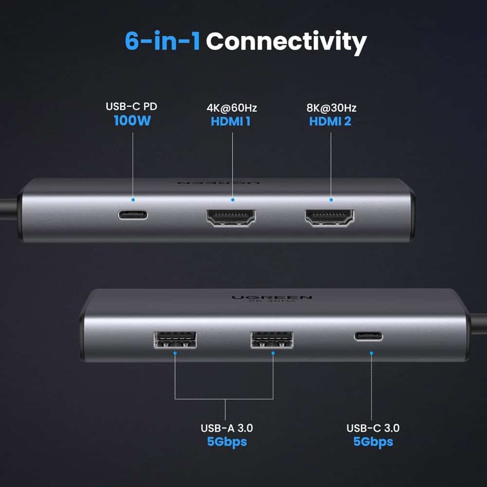 USB-C ჰაბი UGREEN CM498 (15852) Revodok 206, 2 x HDMI, USB, Type-C, HUB, Grey